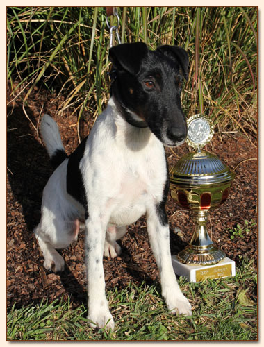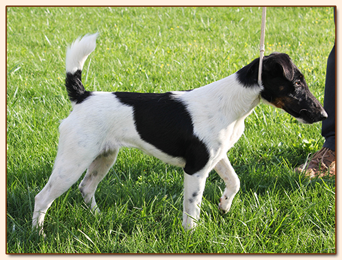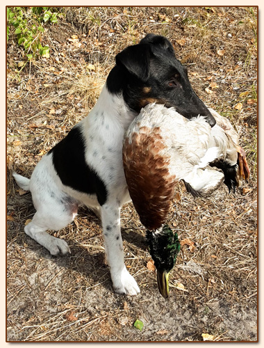 Mary hat schon mit 14 Wochen ihren Spurlaut gezeigt, der mittlerweile so ausgeprägt ist, dass sie auch auf mehrere Minuten alten Spuren und Fährten Laut gibt. Selbst auf Schleppen mit kaltem Wild ist sie laut, was ich bisher bei keinem Foxterrier und nur ganz wenigen Jagdterriern beobachten konnte.