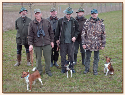 Im Feld bekamen wir dann durch „Luzifer´s Meggy“ eine Demonstration von dem geboten, was ein Foxterrier auf der Hasenspur zu leisten vermag. Der im Winterweizen aus der Sasse hochgemachte Hase flüchtete mit Nackenwind. Nachdem er für die Hündin außer Sicht war, wurde sie vorbildlich 2 Meter nach der Sasse angesetzt. Danach arbeitete sie mit tiefer Nase und super Spurlaut die Hasenspur aus. Dabei kam sie erstaunlich nahe an einem Sprung Rehe vorbei, ohne sich ablenken zu lassen. Selbst als sie nach 1500 Metern an eine kleine Hecke und dann über einen Feldweg auf umgebrochenen Schwarzacker kam, gab sie nicht auf und konnte zur Belohnung schließlich den Hasen stechen und weitere 800 Meter bis ins Nachbarrevier verfolgen. Der mehr als wahrscheinliche Sichtlaut konnte aufgrund der enormen Entfernung nur durch das Fernglas erahnt werden.